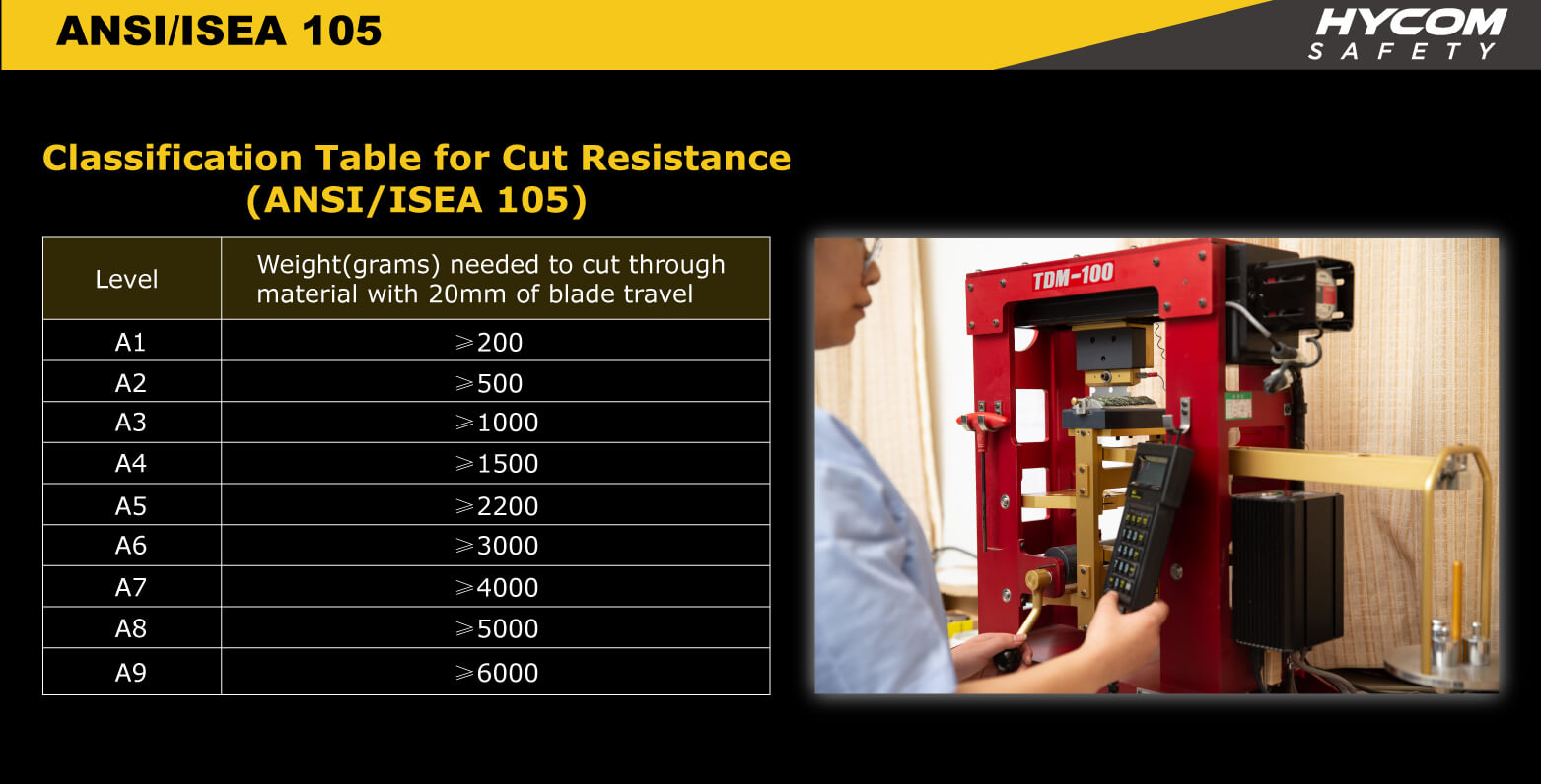 9 レベルの分類に変換されたすべてのテスト スコアの平均、A1 から A9 として報告されたスケール。このスケールは、200 グラムの切断抵抗から 6000 グラムの切断抵抗までの範囲です。この評価システムは、以前の 1 から 5 の評価スケールに取って代わり、新しいセグメント化された評価システムによって以前のギャップが取り除かれ、PPE が提供する保護のレベルを明確に識別しやすくなるため、不十分な PPE の使用を減らすのに役立ちます。